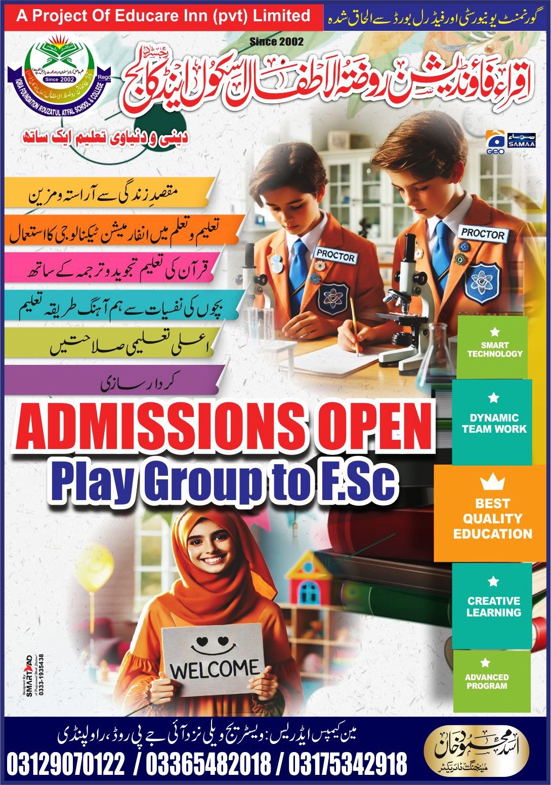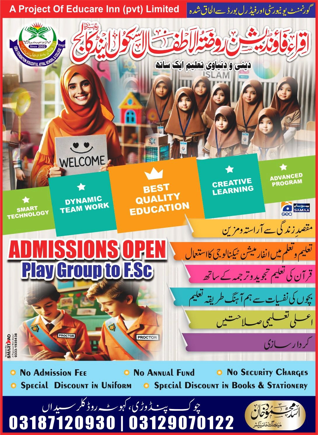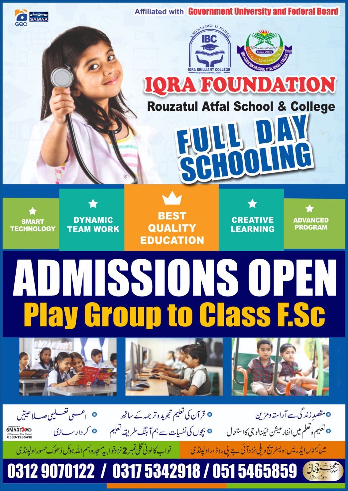Iqra Foundation School & College aims to provide quality education from PreSchool to FSc. We aim for excellence through focused management, improved learning and quality teaching that will help our students to excel in life.